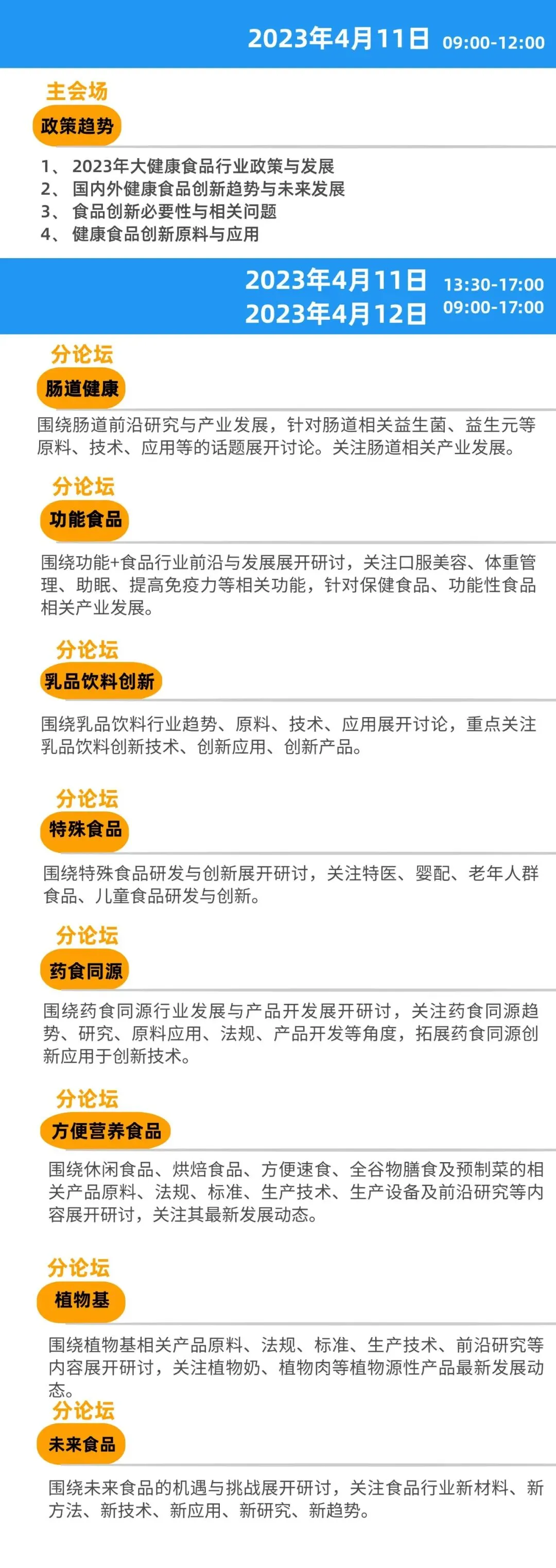 食品科技创新,聚焦食品全产业,历届食品科技创新论坛均设置多个不同方向分论坛。2023年“第六届食品科技创新论坛”将围绕食品行业政策趋势、肠道健康、功能食品、乳品饮料创新、特殊食品、药食同源、植物基、未来食品等多个分论坛主题,全面剖析大健康食品。