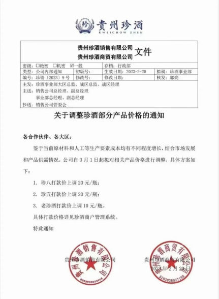 3月1日,珍酒价格调整。其中,珍八打款价上调20元/瓶;珍五打款价上调20元/瓶;老珍酒打款价上调10元/瓶。