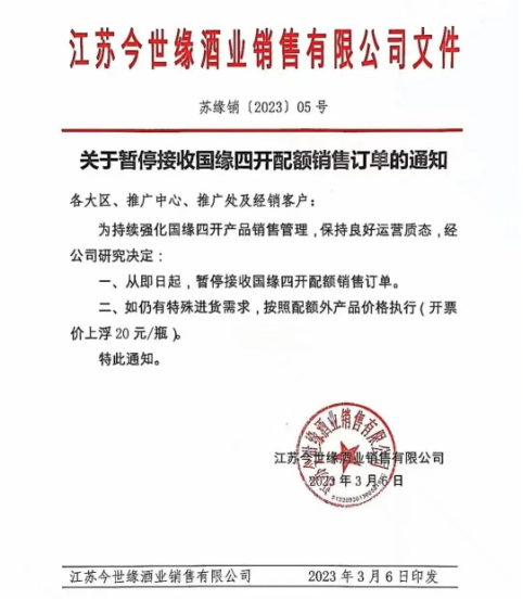 3月6日,今世缘暂停接收国缘四开配额销售订单;如仍有特殊进货需求,按照配额外产品价格执行(开票价上浮20元/瓶)。