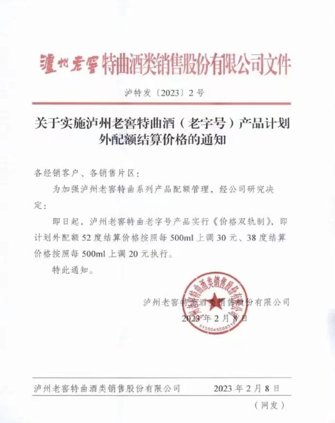 2月8日,泸州老窖特曲老字号产品宣布实行《价格双轨制》,即计划外配额52度结算价格按照每500mL上调30元、38度结算价格按照每500mL上调20元执行。