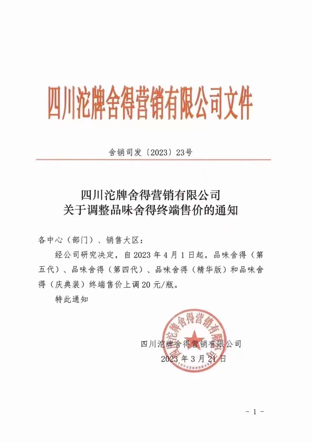 又一家酒企涨价。4月1日起,品味舍得(第五代)、品味舍得(第四代)、品味舍得(精华版)和品味舍得(庆典装)终端售价上调20元/瓶。