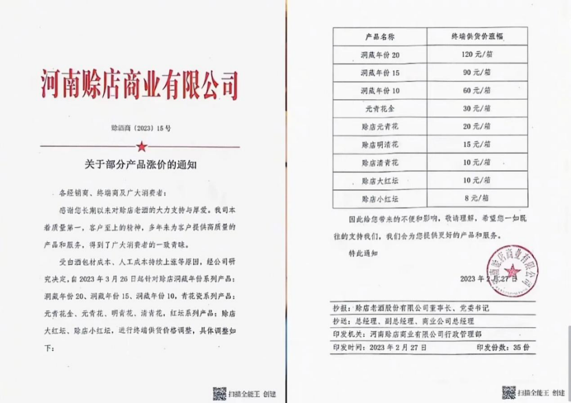 3月26日,赊店洞藏年份系列产品、青花瓷系列产品、赊店红坛系列产品终端供货价格将上涨8-120元/箱不等。