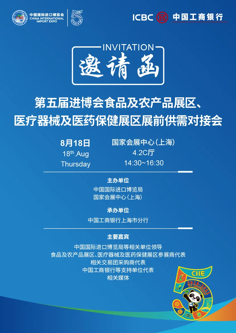 第五届进博会将于2022年11月5-10日举办。中国工商银行上海市分行作为进博会全面合作伙伴,为积极助力客展商搭建环球贸易桥梁,将于8月18日倒计时78天之际,在国家会展中心平行论坛C厅(工银厅)承办第五届进博会食品及农产品展区、医疗器械及医药保健展区展前供需对接会。届时,将有70余家来自食品及农产品、医疗器械及医药保健行业的展商现场参展,还有各种现场互动哦!