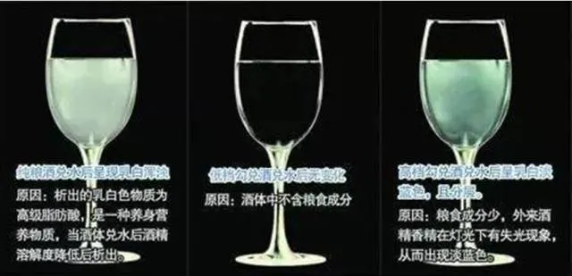 酒精勾兑的酒加入水不失光,纯粮食酿造的酒则出现失光、浑浊的现象。这个是十分正确的,本人亲自试验过。这是因为粮食酒中某些物质在低度酒中溶解度减小,从而析出,造成失光混浊;而酒精中这类物质甚微,所以加水后不会混浊。