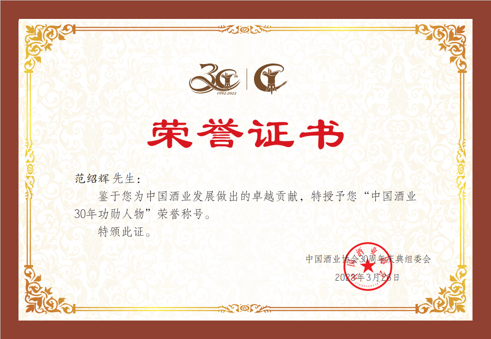 本次,“中国酒业30年功勋人物”奖颁布,共131人获奖。21位行业著名专家学者、63位行业突出贡献领导人、23位科技带头人、24位行业组织管理模范获此殊荣。范绍辉,一直以来秉承“振兴粤酒”与“振兴中国白酒酒庄”的行业使命,致力清雅品类产品提升,开拓粤酒产业规模,并通过建立多个文化平台及开展文化活动,为中国酒业高质量发展及粤酒振兴做出探索与贡献,本次荣膺中国酒业30年功勋人物——行业突出贡献领导人,体现了他对中国酒业发展的推动成果及重要引领作用。