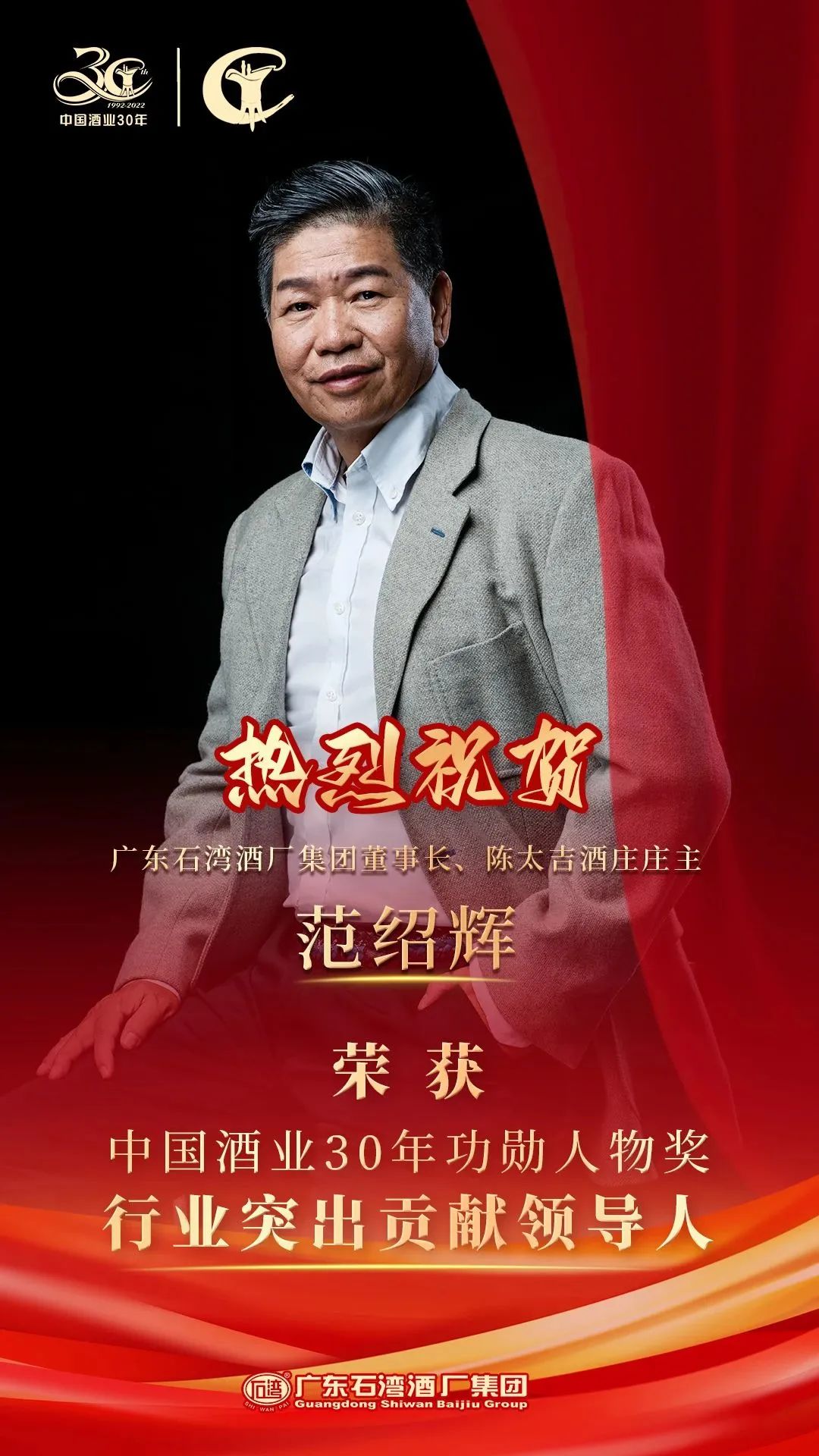 3月26日,中国酒业协会第六届理事会第五次(扩大)会议暨中国酒业30年庆典活动在山东泰安召开,庆典上对扎根酒业一线、赓续酒业传承的酒业模范授予了“中国酒业30年功勋人物奖”荣誉称号。广东石湾酒厂集团董事长范绍辉荣膺“中国酒业30年功勋人物——行业突出贡献领导人”荣誉表彰。