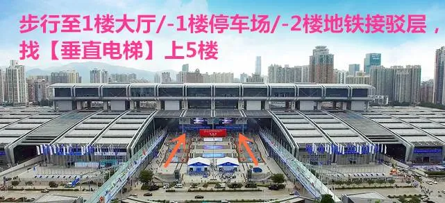 到达会展中心,请按橙色箭头指引步行至1楼大厅或从-1楼停车场或-2楼地铁接驳层,找到【垂直电梯】上5层,按地贴指引方向,找到举行进口商品对接会的向日葵厅。
