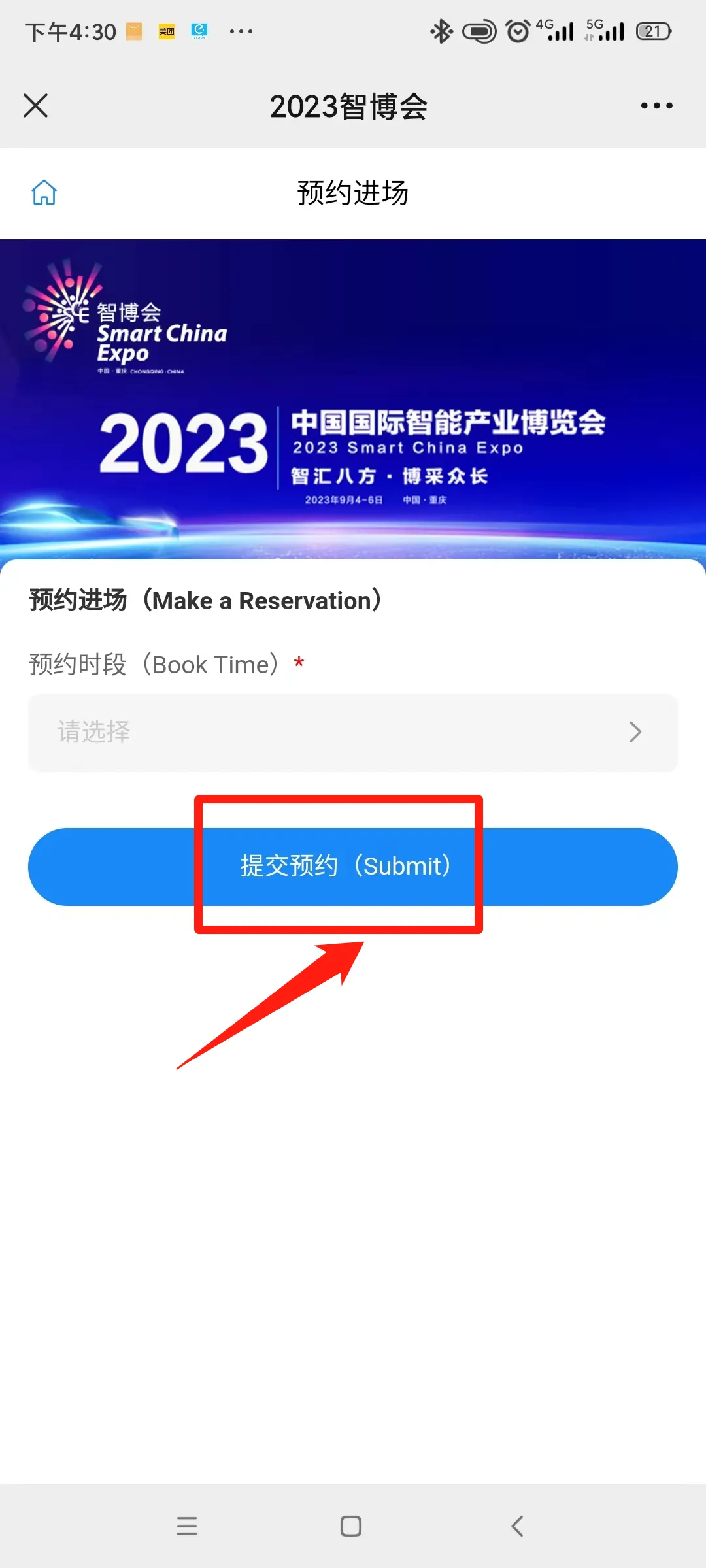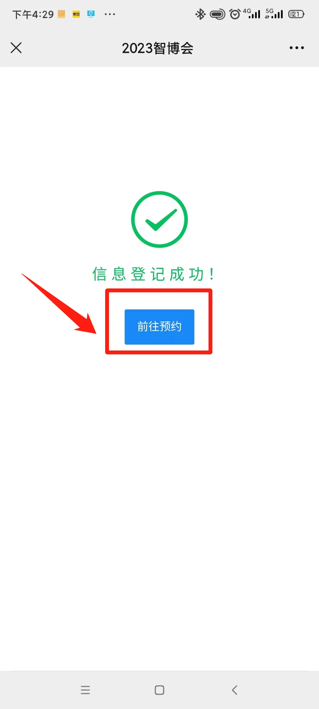 3.身份核验成功后,会自动显示信息登记成功,再点击“前往预约”,预约相应进场时段,点击提交预约”。