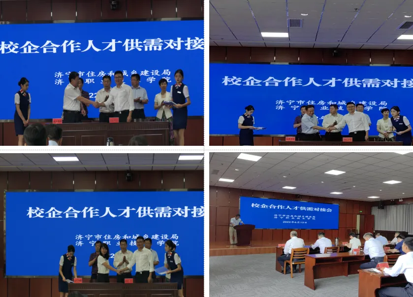 6月13日上午,济宁市住房和城乡建设局与济宁职业技术学院,就共同推动全市住房城乡建设事业高质量发展,探索校企合作新模式,召开2022年校企合作人才供需对接会。市住房城乡建设局党组成员、四级调研员赵羽,济宁职业技术学院工会主席杨淑启出席并致辞。济宁职业技术学院与六家建筑业企业代表会场签订合作协议,建筑业企业和学生代表分别发言。