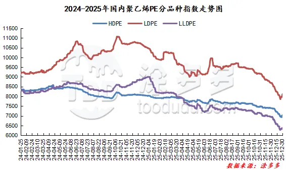 12月PE市场迎来年内下行加速期,价格跌至四季度低点。供应端,国内装置高负荷运行、前期检修装置密集重启及新增产能释放,叠加海外低成本货源到港增加,现货供给持续充裕,企业及社会库存去化节奏大幅放缓。需求端,下游全面进入传统淡季,农膜旺季收尾、地膜需求未启,包装膜、管材等核心领域订单增量有限,再生料替代率提升进一步挤压原生料需求,下游仅维持刚需补库,难以承接充裕现货。成本与期货端,国际油价震荡对成本支撑微弱,期货合约疲弱震荡的走势,进一步拖累现货市场心态。贸易商为加速去库普遍让利出货,拉低市场成交重心,而行业产能扩张与终端需求增长不匹配的结构性矛盾,最终使得价格缺乏回升驱动力,持续承压下探。