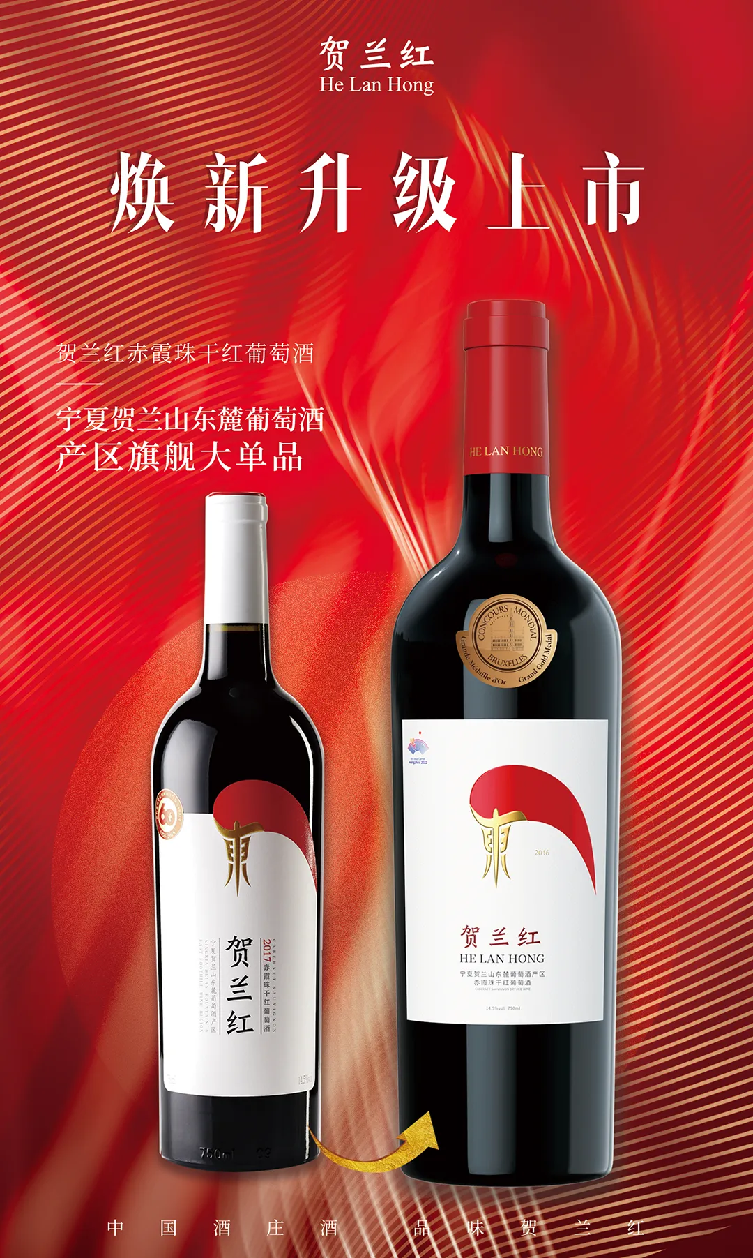 4月份,贺兰红普通版将推出升级款,升级款在产品设计上有了明显提升:形象设计在原有“东”字基础上进行了升级,潇洒飘逸的“東”字形态象征着贺兰山东麓葡萄酒产区形象,并从中国传统酒器“樽”中汲取设计灵感。樽代表着中国的酒文化,是中国酒文化仪式感的体现,如此设计,不仅提升了品牌辨识度,更是个性化和高级感的表达。