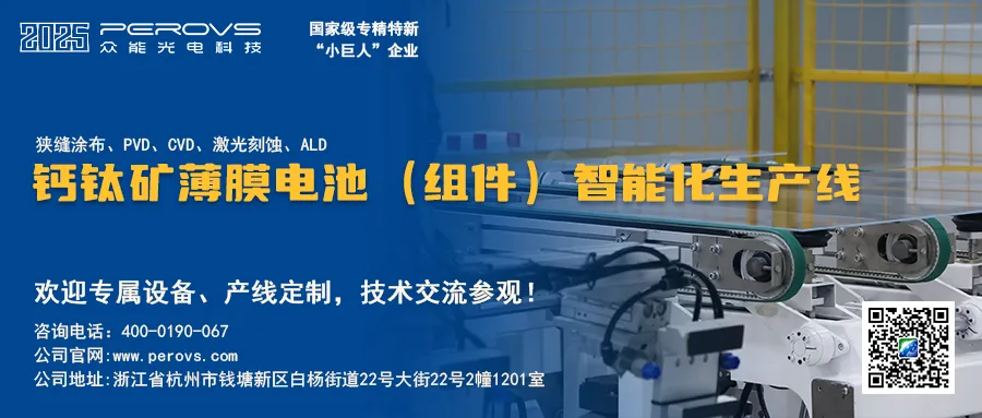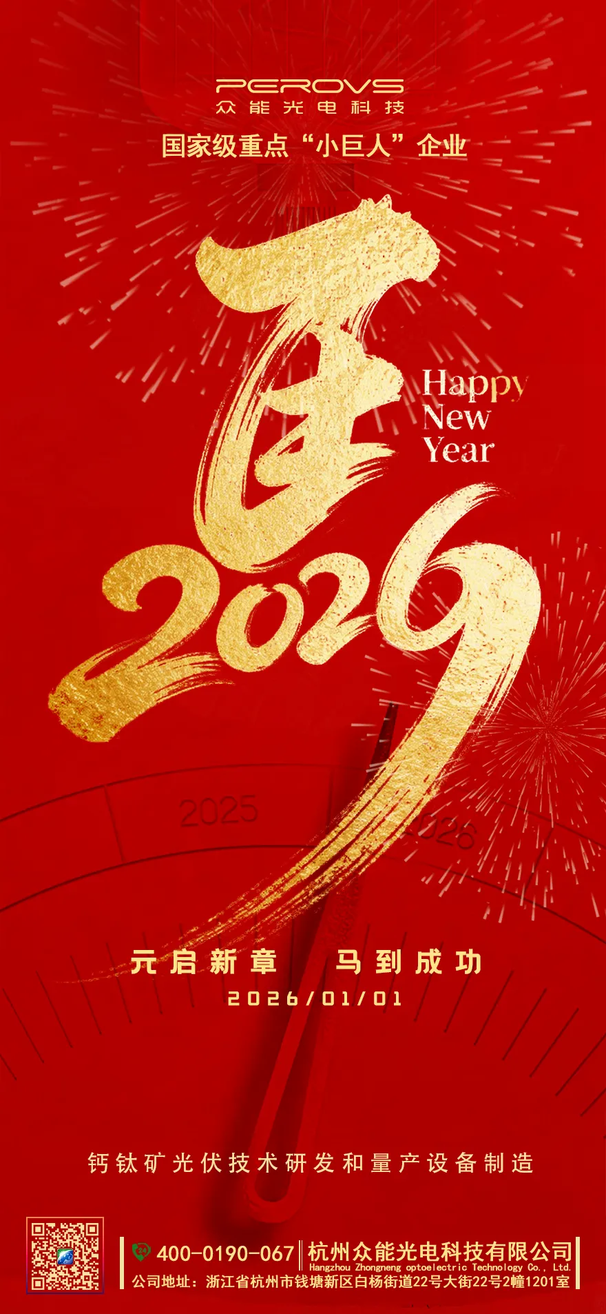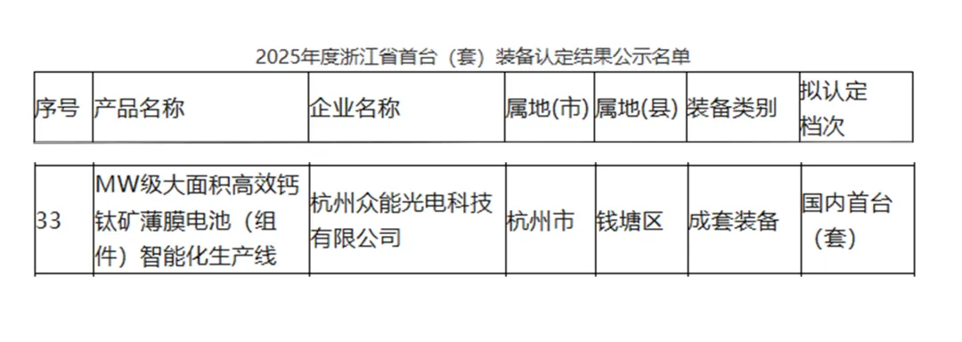 岁序更替,华章日新。在 2025 年元旦佳节来临之际,杭州众能光电科技有限公司传来重磅喜讯 —— 自主研发的 “MW 级大面积高效钙钛矿薄膜电池(组件)智能化生产线” 成功入选 2025 年度浙江省首台(套)装备名单,获评 “国内首台(套)” 等级,为新年开篇写下硬核注脚,也为我国光伏高端装备自主化再添关键成果。