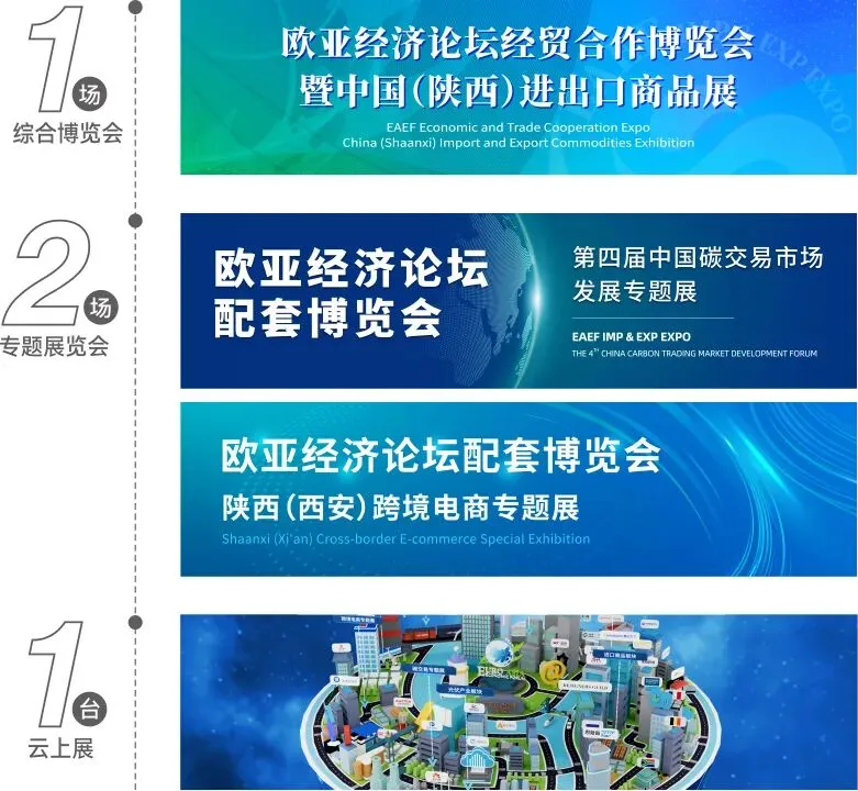 作为立足西部、辐射全国、面向欧亚的经贸合作平台,欧亚经济论坛配套博览会,创新“1+2+1”模式,将以1场综合博览会、2个专题展会(陕西(西安)跨境电商专题展、第四届中国碳交易市场发展专题展),1台“云上展”,凸显“高规格”的展会标准,升级展会模式,打造全新格局。