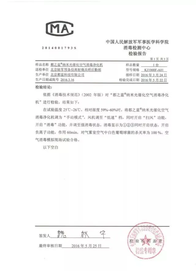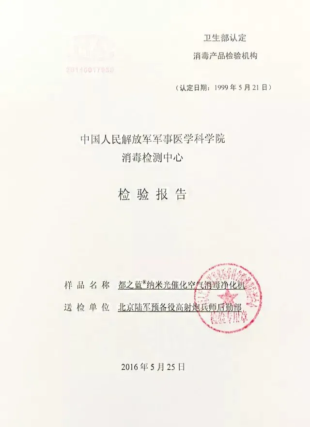 吴昊提示记者注意“都之蓝”空气消毒机的检测报告:“这份检测报告含金量很高,是由中国人民解放军军事医学研究院消毒检测中心出具的,它是两家国家级消毒检测机构之一。”