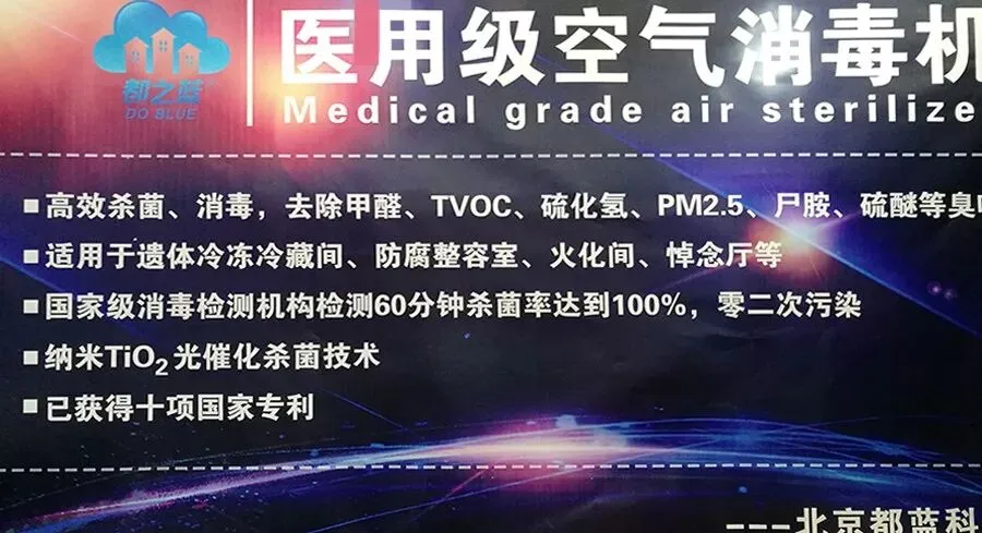“都之蓝”空气消毒机开启30分钟,灭菌率可以达到99.99%,开启60分钟可以达到100%。目前,山东省德州殡仪馆、广东省广州银河园殡仪馆、河南省新乡殡仪馆已使用“都之蓝”空气消毒机,主要用于遗体整容化妆室等殡仪服务场所。
