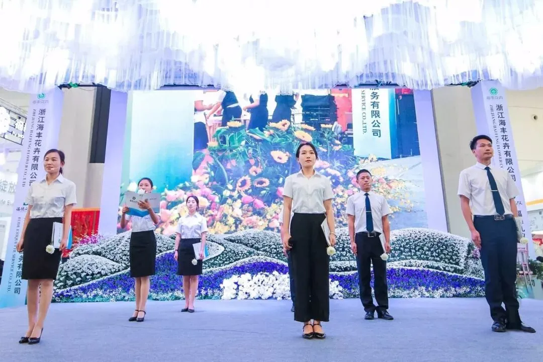 据浙江海丰花卉有限公司董事长吴海峰介绍,此次博览会,浙江海丰花卉有限公司(以下简称海丰花卉)参展,并以“如花生命,芬芳永驻”为主题,为殡仪礼仪演示厅提供了整套会场花艺布置,体现了公司“播种美好生活,诠释完美人生”的一贯宗旨,赢得了业界同仁的一致好评。