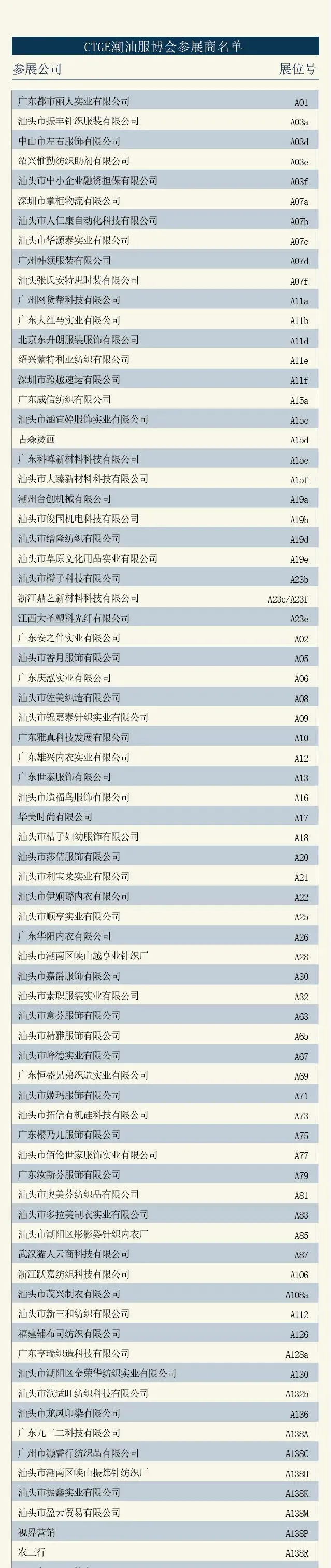 汇聚名企强势出击,30+汕头纺织龙头企业,300家参展企业/品牌盛装以待!其中包括芬腾、宏杰、都市丽人、安之伴、凯迪、猫人、拉飞逸、茂兴、跃嘉、蓝天成、明德、盛强、亿威泰、世泰智造、爱戴、万康、荣杰、香月、华阳、新美婷、曼娜、闺蜜本色、玉姿一族、雅真、造福鸟、莎倩、利宝莱、汉亨实业、泰迪博士、精雅、佰伦世家等行业龙头企业以及澄海毛织产业集群将重磅参加展会,并携带创新研发的新产品亮相展会。
