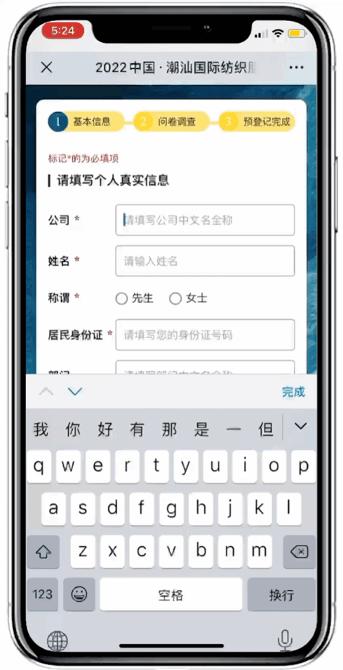 验证通过后,请准确填写姓名、身份证号、公司全称、部门/职务、邮箱等参观信息,并如实进行完善问卷调查。