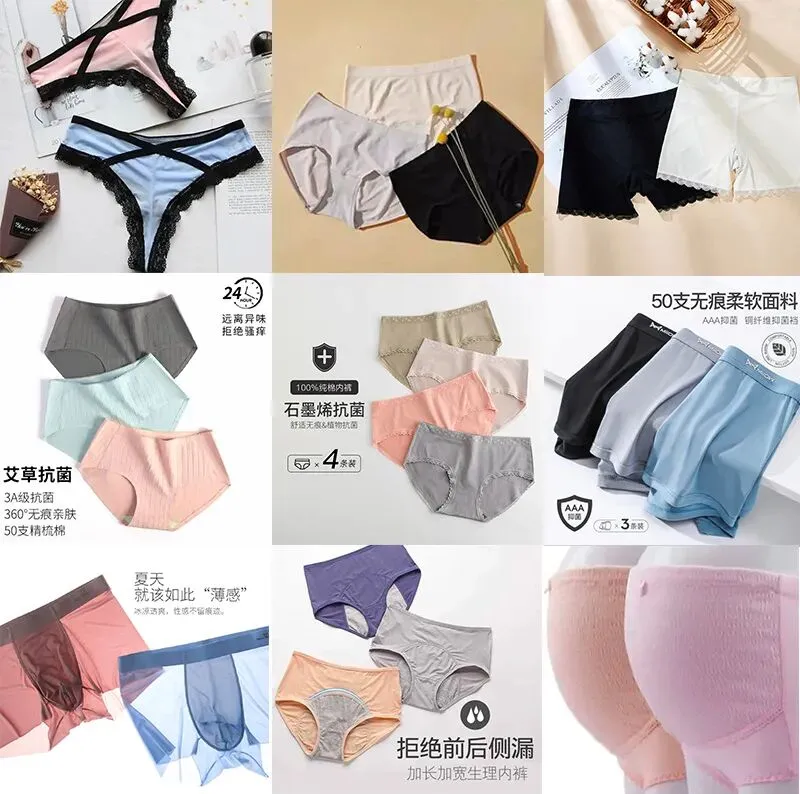 款式系列:四角内裤、三角内裤、T字裤、安全内裤、孕妇内裤、大妈内裤、无痕内裤等; 材质系列:蕾丝内裤、棉内裤、莫代尔内裤、粘纤内裤、锦纶内裤、汉麻内裤、腈纶内裤、真丝内裤、冰丝内裤、全棉内裤、蚕丝内裤等; 功能系列:超薄速干、单向导湿、石墨稀、暖宫、提臀塑形、生理内裤等; 抗菌系列:植物艾草、生姜抗菌、铜纤维底档、银离子底档、锌离子底档等; 男士内裤系列:车缝男式内裤、贴合男式内裤、肥佬内裤、运动内裤等;