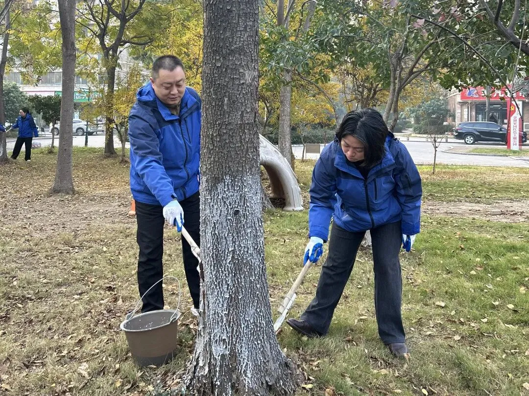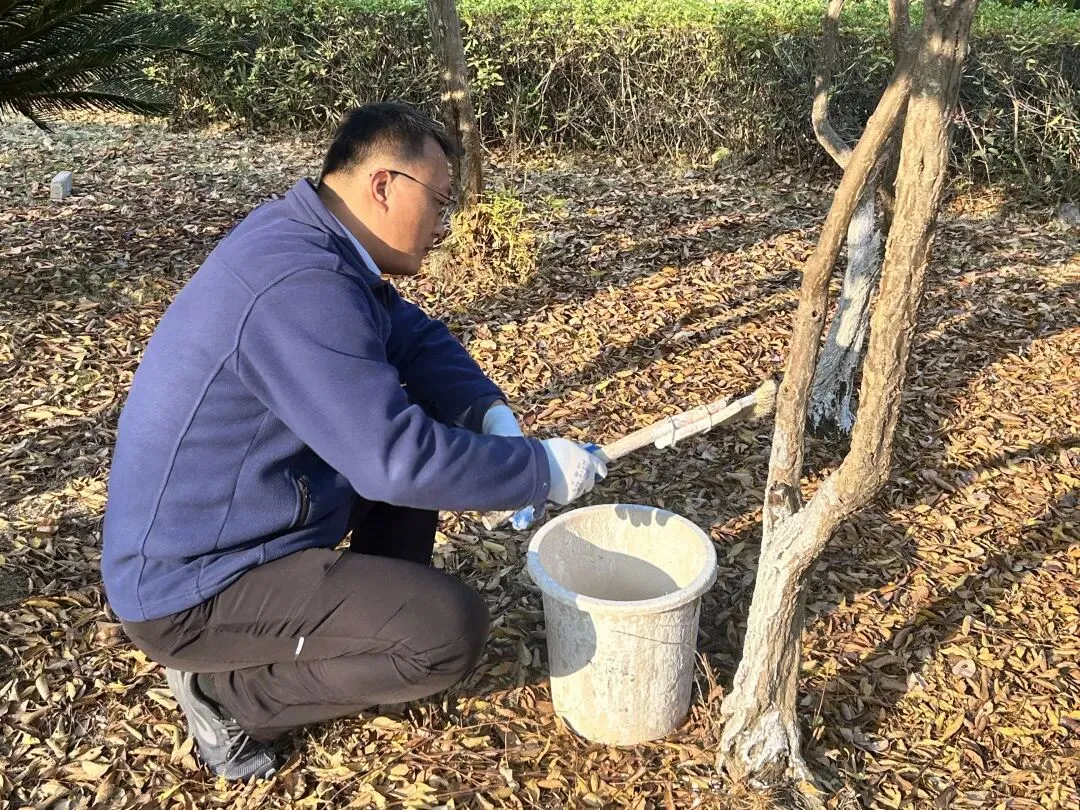 活动现场,党员们化身 “护绿使者”,分工协作、干劲十足。王丽娜书记与唐韬副书记率先示范,带领大家手持毛刷从树木根部均匀涂刷,严格把控涂刷高度与涂层厚度,确保涂白剂全面覆盖树干。所用涂白剂是由生石灰、硫磺粉、油脂、水、食盐等原料科学调配而成,既能杀灭树皮缝隙中的越冬虫卵和病菌,有效预防来年病虫害滋生,又能通过白色涂层反射阳光,避免枝干因昼夜温差过大发生冻裂。