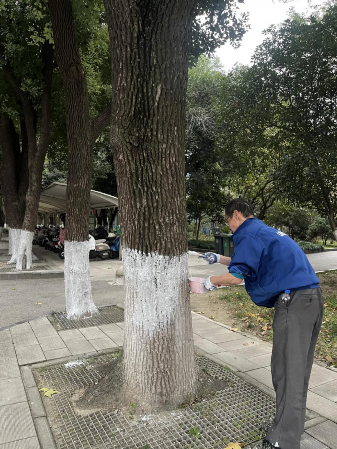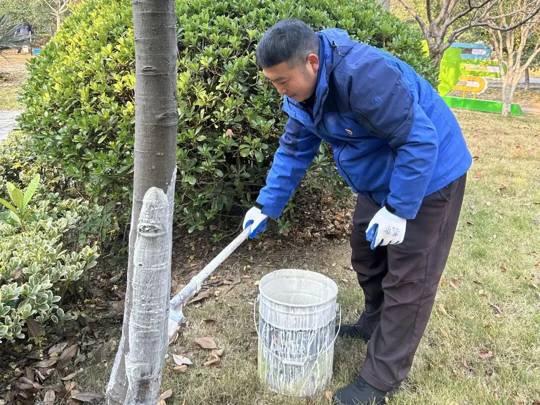 随着寒潮临近,气温逐步下降,为保障小区内树木安全越冬,连日来,服务中心组织绿化人员开展树木冬季保暖刷白作业,为园区内的行道树、景观树精心“梳妆”,用细致养护守护小区绿色生态。