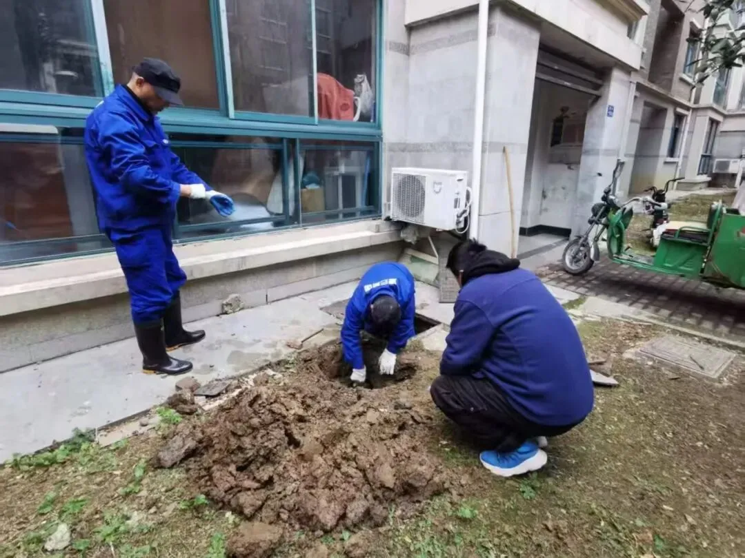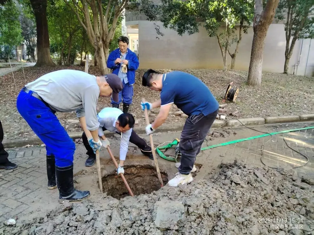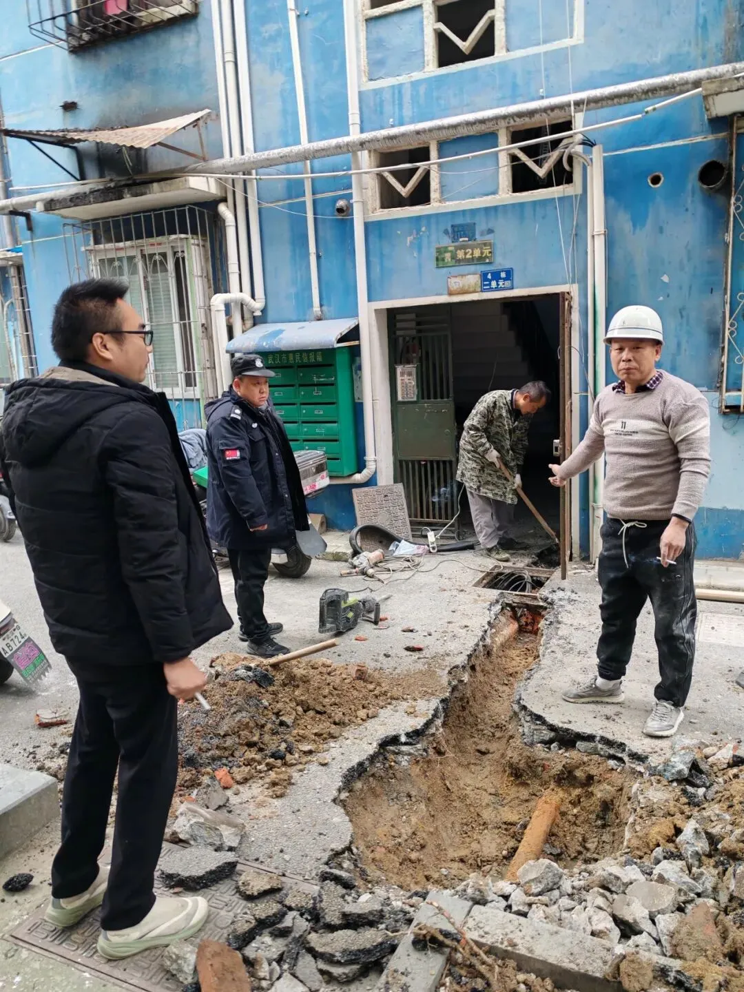 11月6日清晨,E区509栋旁的步道上,安保巡查再次发现路面渗水。维修班组带着工具迅速到场:先设置围挡警示、疏散周边行人,再按“听漏—打洞—清淤”的流程有序作业,找到漏点后,白师傅蹲在泥水中熟练操作哈夫节,不到1小时就完成了管道封堵。考虑到该区域是居民日常通行要道,维修人员当天就完成了路面回填与平整,后续两天还持续跟踪水压、巡查路面沉降,确保“修一处、好一处”。
