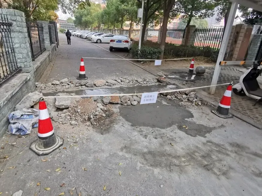 “路面突然冒水、地砖湿滑打滑”——10月中旬,308栋与403栋之间的道路上,安保巡查员通过对讲机紧急报备险情。赶到现场时,路面已积起浅浅的水洼,水流顺着地砖缝隙不断往外渗。物业维修班组第一时间启动“漏水应急流程”:维修师傅带着听漏仪趴在地面仔细探测,循着水声精准定位管道走向,随后用冲击钻小心破开路面——这是管道抢修的第一步“听漏打洞”。