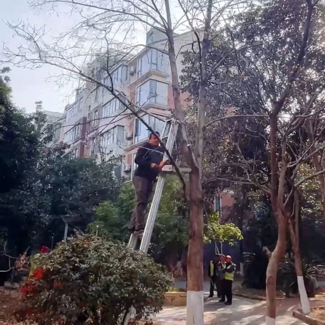 因作业涉及电网安全及营房北村相关权益,作业前期,工作人员通过召开协调会、实地走访沟通等方式,制定了周密的工作计划。作业期间,在硚口区供电局专人指导下,对修剪树木周围进行安全隔离,专业修剪团队严格按照安全规程操作,借助专业登高设备,对搭触高压线及存在安全隐患的枝条进行精准修剪,现场安排了安保人员,全面监督作业过程,确保修剪工作安全、有序进行。经过数日努力,成功消除了安全隐患。