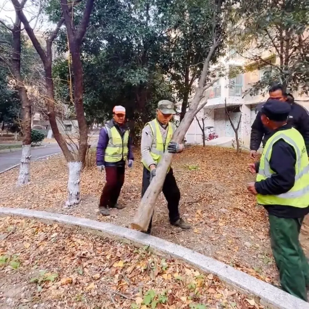 此前,园区内部分树木因枯萎出现枝干腐朽、根系松动的情况,随时可能发生枯枝掉落、树木倒伏的问题,对过往行人和车辆构成极大威胁。为高效且安全地完成清理任务,物业提前发布通知提醒业主绕行作业区域,同时组织专业施工团队,配备专业工具进场操作。工作人员严格按照安全作业规范,依次开展枯枝修剪、枯树锯断、枝干清运及树桩清理等工序,全程做好安全防护与现场秩序维护,确保清理工作高效、安全推进。