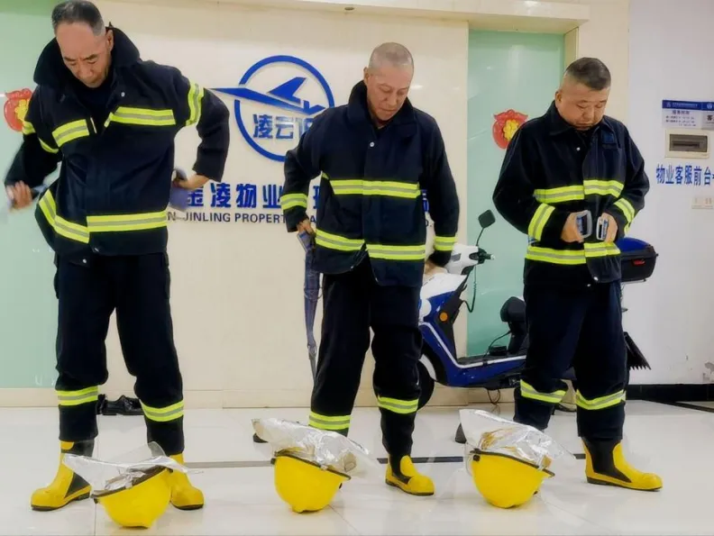 为提升安保团队应急处置能力,深化对消防设施的熟悉度,园区物业围绕“从快速反应到实战应用”目标,开展专项消防应急演练,将安全保障落在实处。 演练聚焦“速度”与“协同”两大核心:在消防技能比拼环节,安保人员围绕消防服穿戴展开竞速,从打开装备箱到全副武装待命,最快仅需45秒,不仅锤炼了快速反应能力,更在操作中强化了对消防服、装备箱等设施的使用熟练度;夜间防暴处突实训中,安保人员配备防暴盾、钢叉等装备,模拟园区突发情况,严格遵循“1分钟响应、3分钟处置”标准,在协同处置过程中,进一步明确各类应急设施的摆放位置与使用场景。