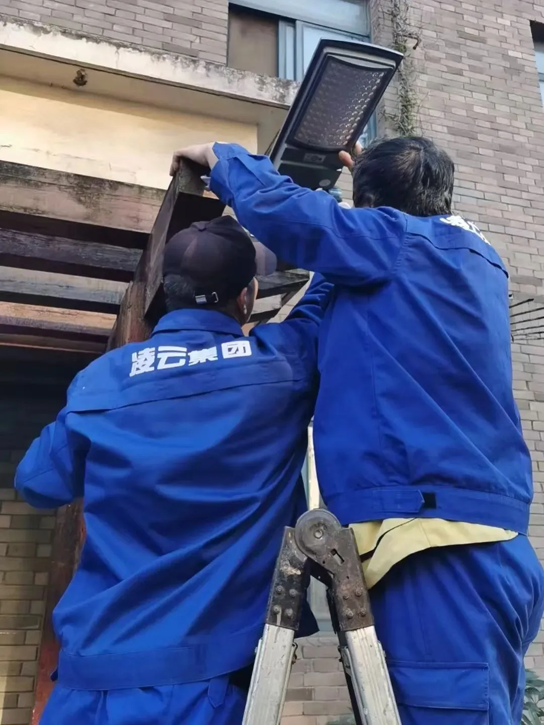 从勘察点位到安装调试,工程维修团队仅用3天便完成了这项便民工程:11月21日傍晚,工作人员带着工具来到601栋,先在楼梯通道墙体固定灯具支架,又在单元门檐处校准太阳能板角度,确保白天蓄电、夜间自动亮起。身着深蓝色工装的工作人员在梯子上忙碌作业,从接线到测试亮度,每一步都反复核对,连灯罩角度都微调了三次,只为让光线刚好覆盖居民通行区域。