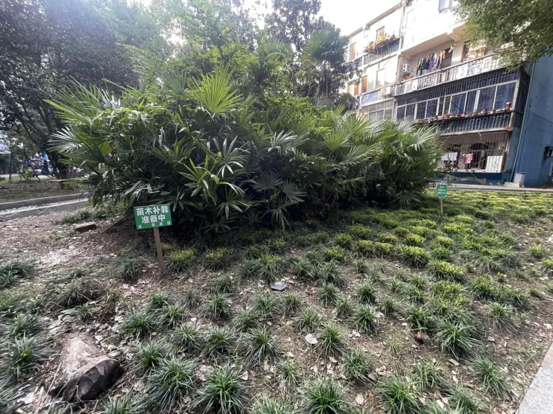 小区部分绿地因日常踩踏、自然老化等原因,出现麦冬枯萎、裸露斑秃现象,影响了绿化的整体性和观赏性。前期工作人员实地勘察、统计补种面积,补种过程中,工作人员严格按照种植规范,清理杂草、翻松土壤、定点栽种、浇水压实,每一道工序都细致到位。经过数日奋战,裸露的绿地被整齐的麦冬苗覆盖,一抹新绿为小区增添了生机与活力。