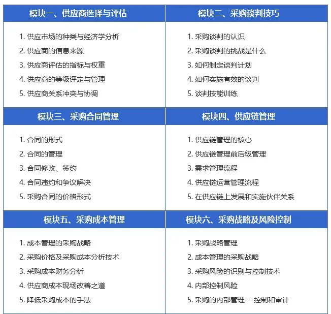采购从业人员,一定要从根本提升自己的核心竞争力以及专业能力。比如:CPPM证书涵盖的六大核心模块,就是涵盖了整个采购供应链行业的方方面面,重实战,轻理论的课程体系,更加适合国内采购人学习提升,符合国内采购行情发展!