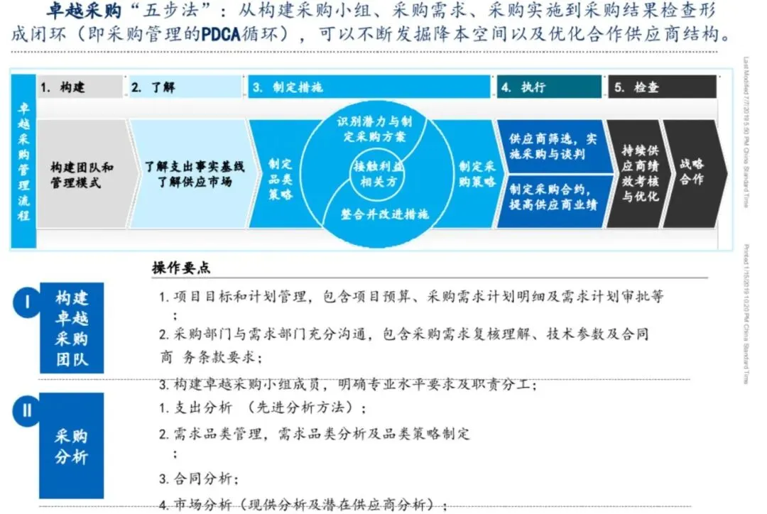 卓越采购的实施可遵循“五步法”展开:首先跨职能组建采购小组,整合技术与业务视角;其次深入挖掘需求本质,识别成本动因与风险点;接着制定差异化采购措施,平衡效率与控制;随后通过标准化流程执行采购动作;最后建立检查机制,持续追踪效果并迭代优化。该方法强调端到端的协同,将采购从被动响应转为主动价值创造环节。
