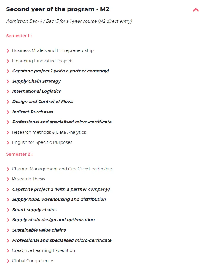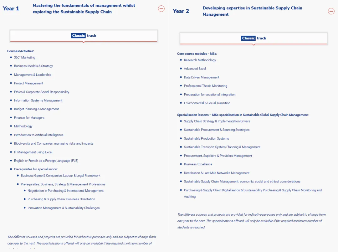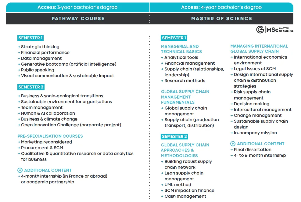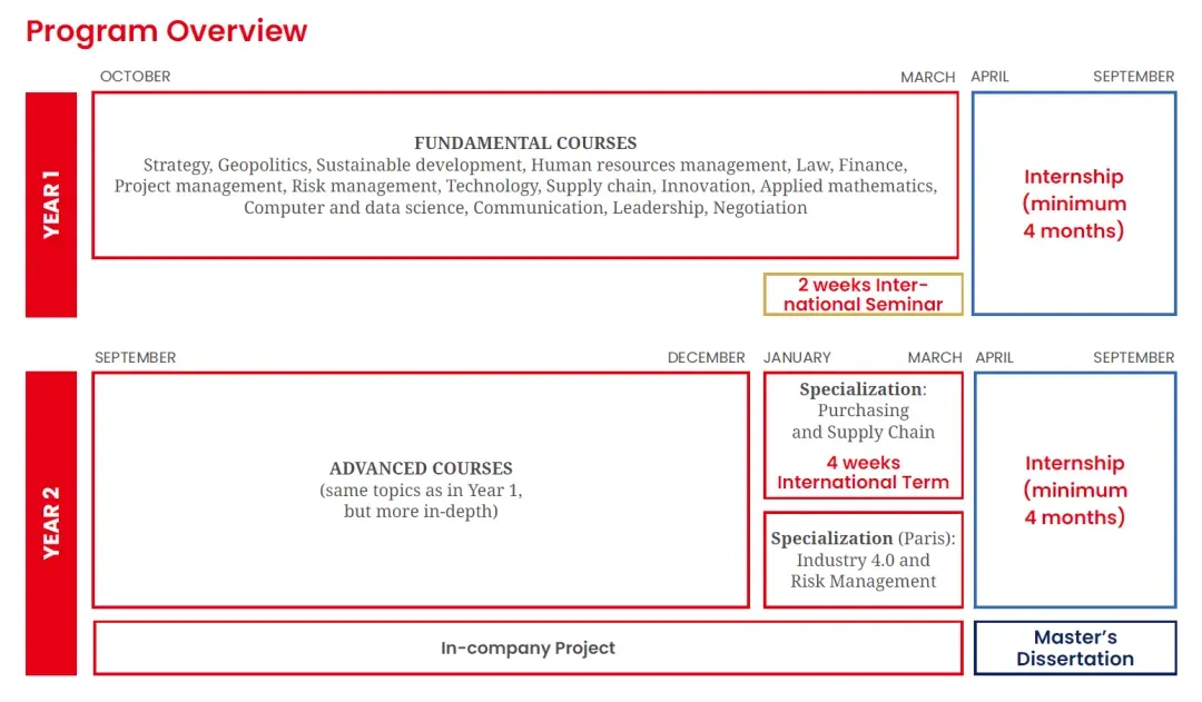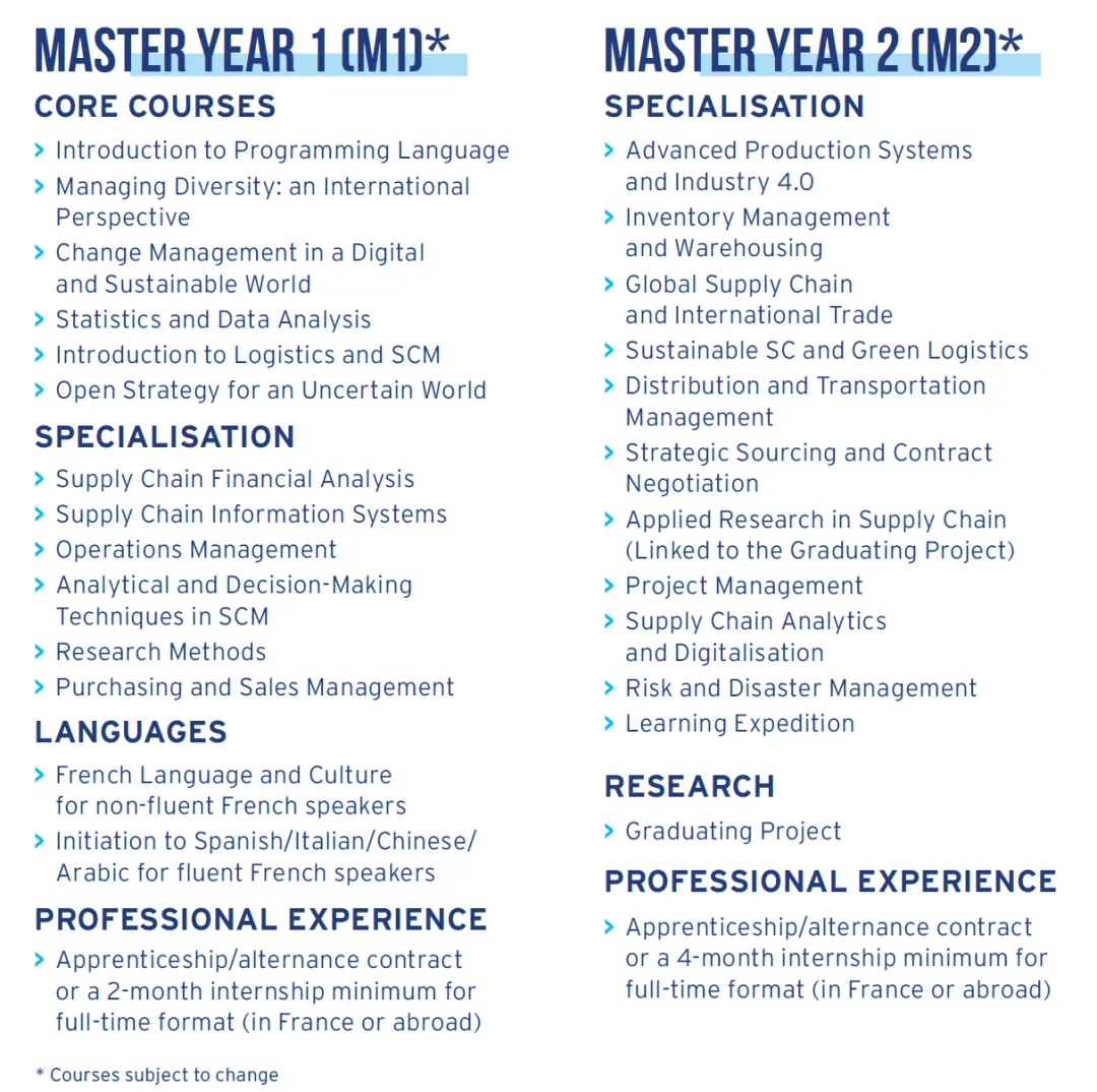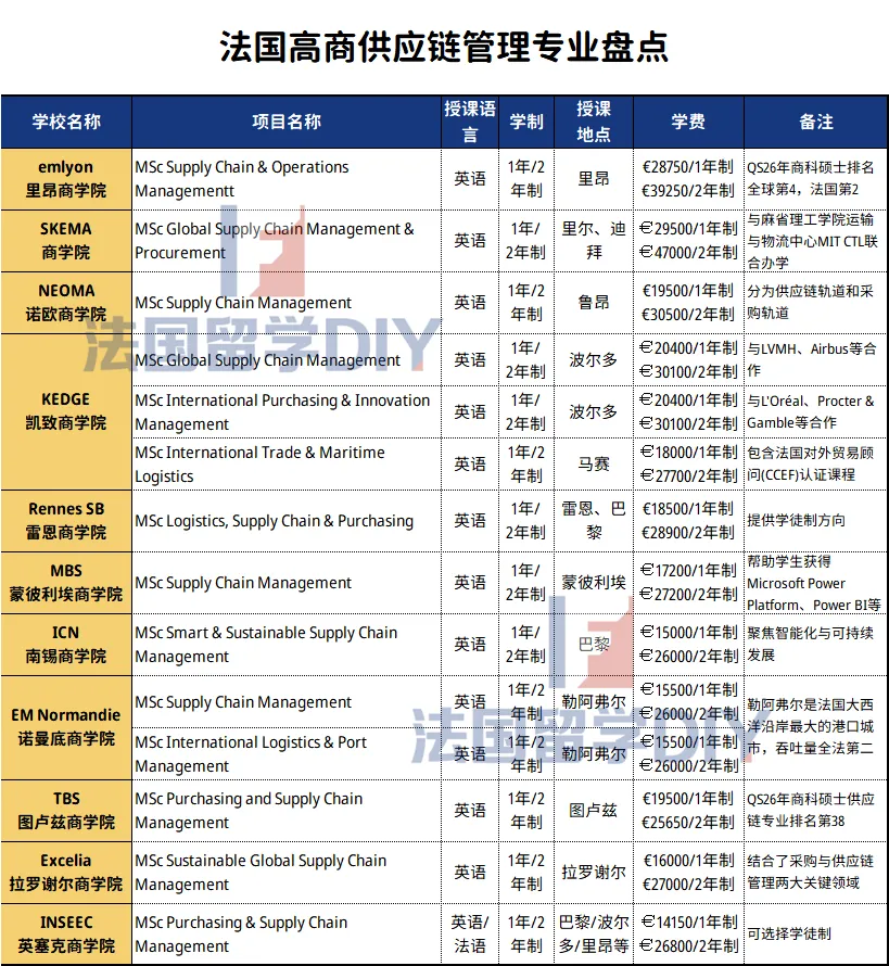 英语授课,1年or2年学制,巴黎校区,学费€15000/1年制,€26000/2年制 聚焦智能化与可持续发展两大趋势,紧贴未来供应链变革方向 开设在巴黎La Défense校区,周围云集了法国顶尖企业总部,方便学生与企业、校友及导师进行高频互动 课程设计贴合全球化运营背景,融合理论 + 实践 + 企业项目,培养综合实战能力 适合希望进入国际物流、采购、供应链管理领域的学生