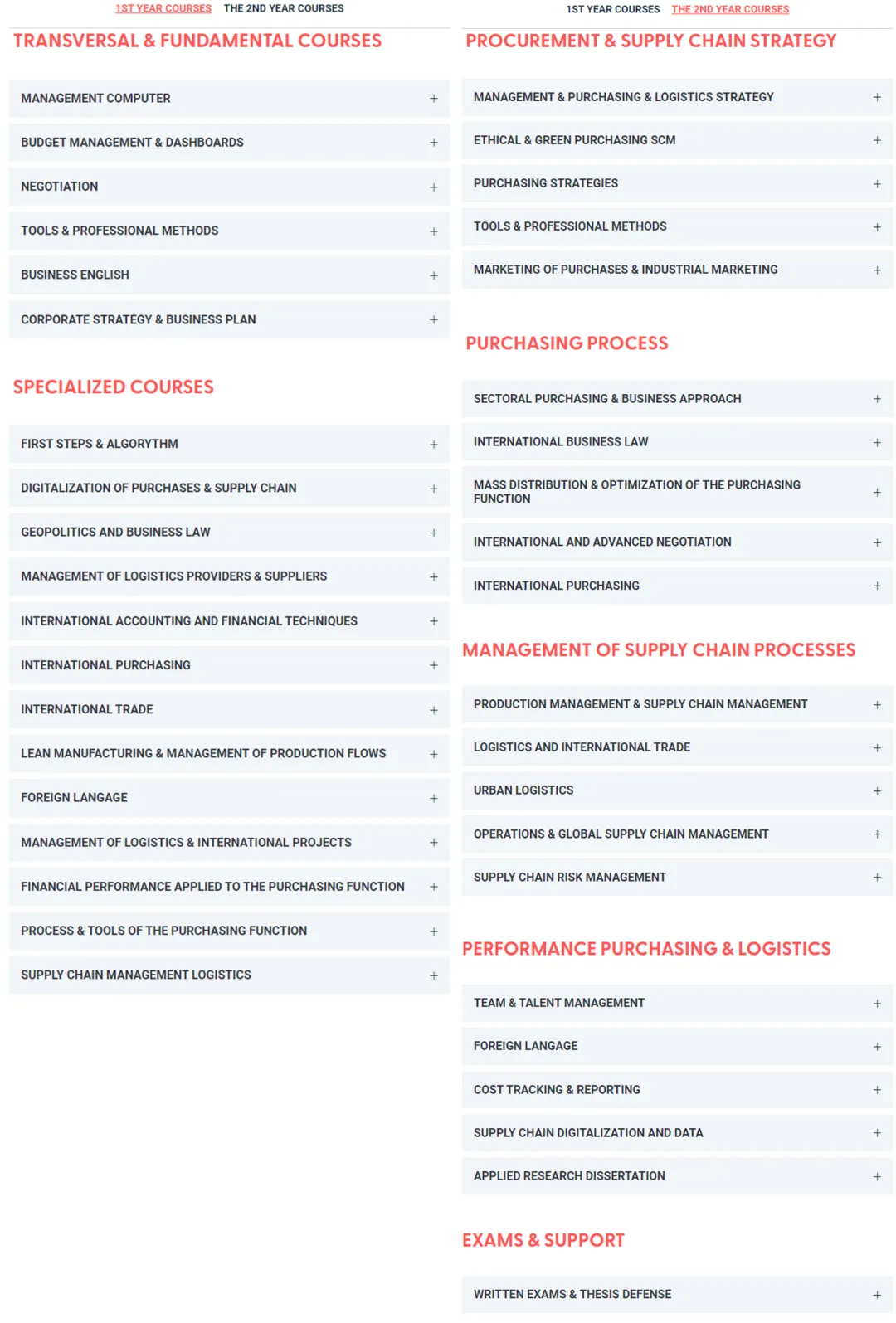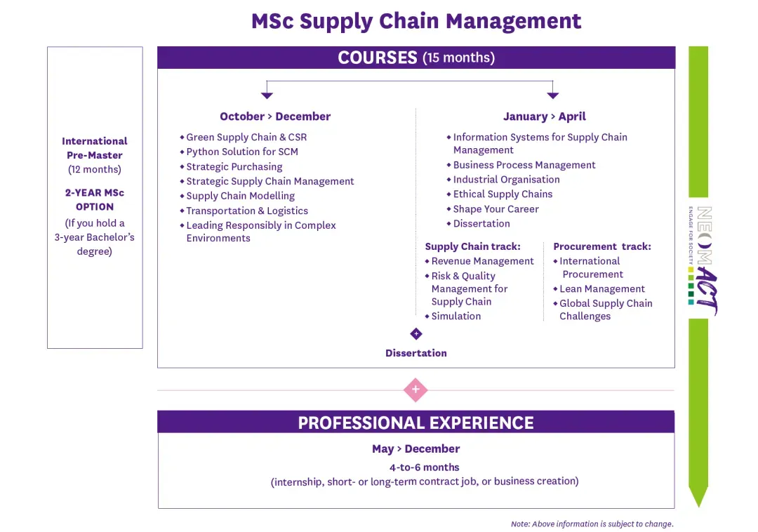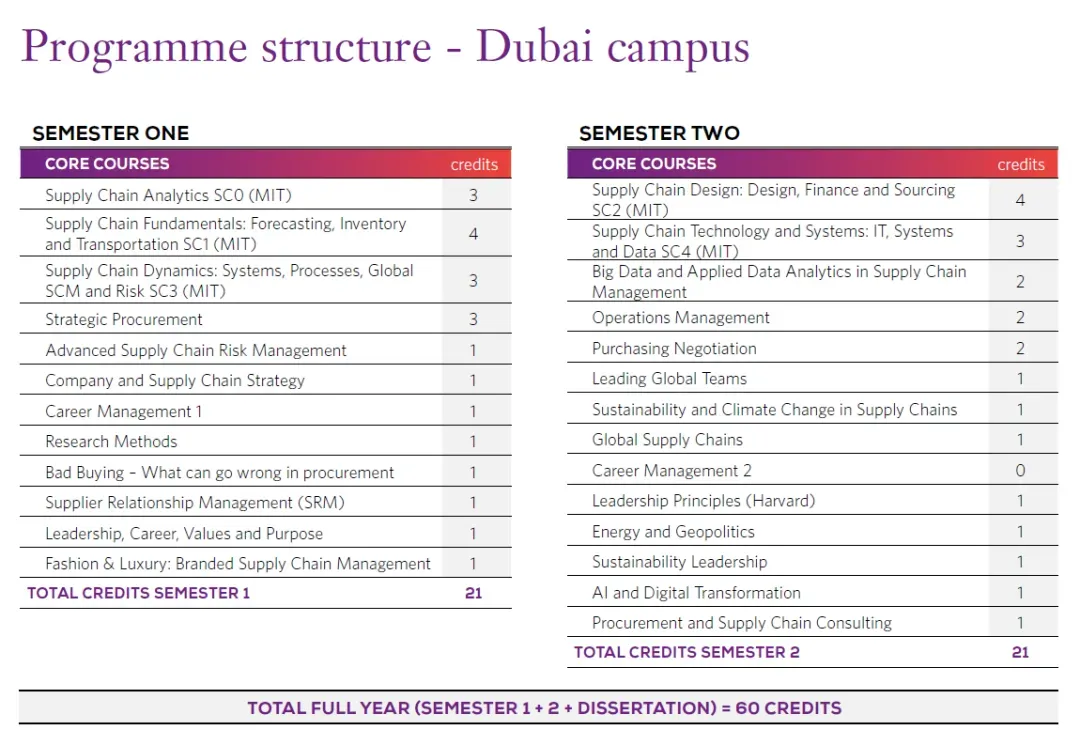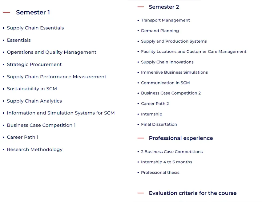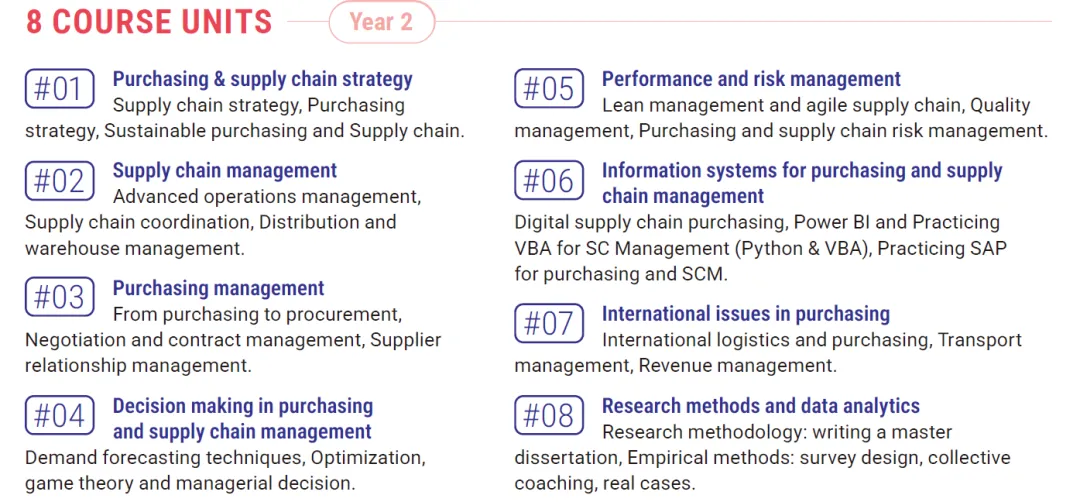 课程涵盖管理、经济学、财务、采购功能、国际贸易等基础课程,后续还有供应链与运营管理的专业课程,结合项目管理、数据科学、行业4.0等新兴领域