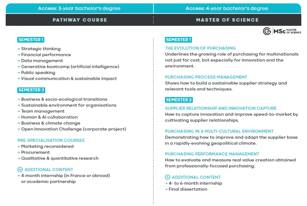 国波尔多、巴黎、里昂等多个城市授课。提供法语和英语授课,适合所有国际学生 - 毕业生可从事采购经理、国际采购员、供应链经理、物流师等职位