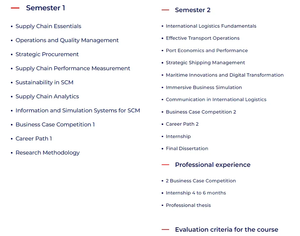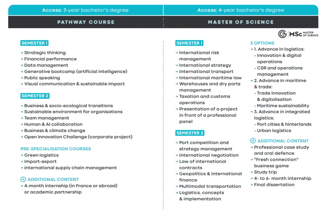 项目在2025 Eduniversal全法最佳硕士排名,“国际贸易&物流管理”类别中全法第4 课程涵盖国际贸易、物流和国际运输,全面应对全球商业环境的复杂挑战,使学生能在全球市场中取得成功 课程面向全球市场,培养学生的国际视野与跨文化沟通能力 聚焦海事产业,全球90%的贸易通过海运完成,学生深入了解海事物流的重要性 提供三个专业方向选择:物流、海事与贸易、综合物流;满足不同职业规划需求 项目包含法国对外贸易顾问(CCEF)认证课程,使学生能获得全球认证的专业资格,连接全球4,300名成员的国际网络 包括访问鹿特丹港的海外学习之旅,深入了解国际贸易与物流中的挑战与机遇