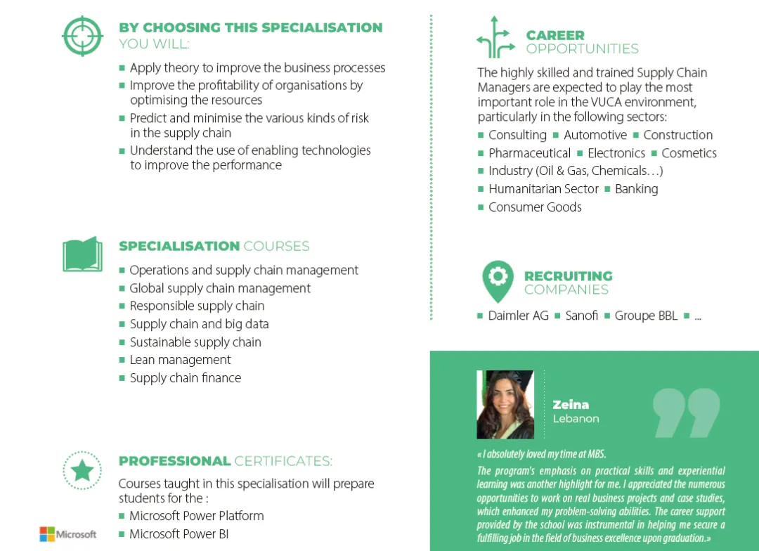 结合理论知识与实践技能,通过实际项目和案例研究进行学习 关注绿色供应链和企业社会责任(CSR)等可持续实践 为获得PMI和六西格玛等行业认证做好准备,使用先进IT工具(如SAP和Visual Basic) 国际视野,掌握国际采购,能够有效应对跨文化挑战 提供两个专业方向供学生选择:供应链或采购方向