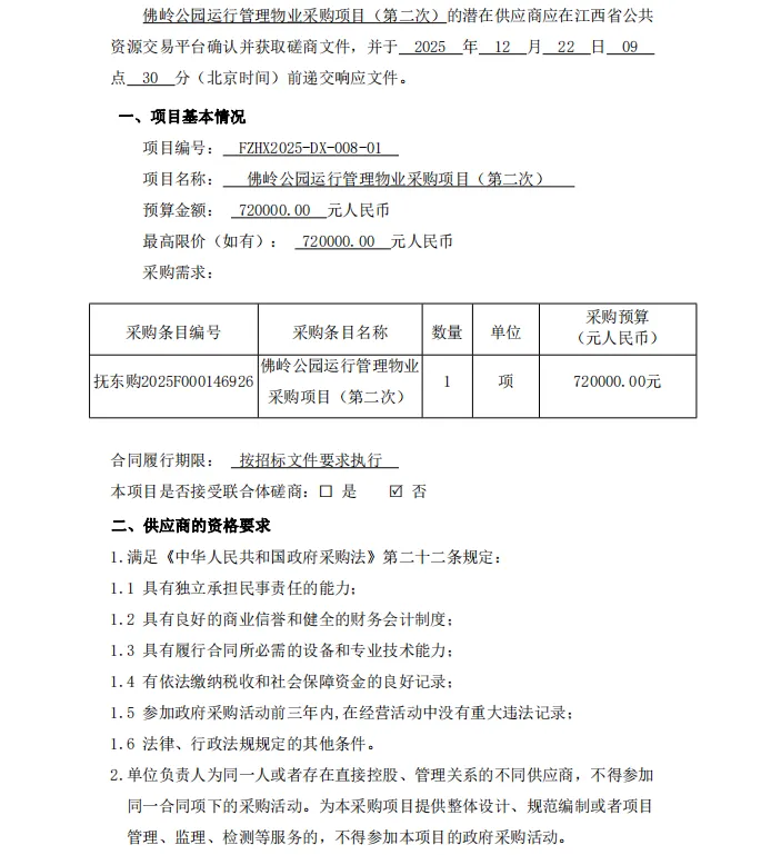 佛岭公园运行管理物业采购(第二次)项目的公告