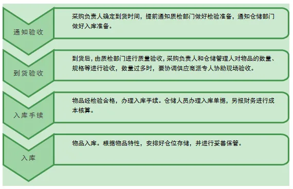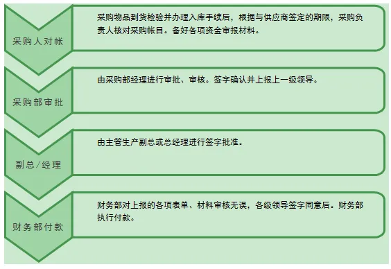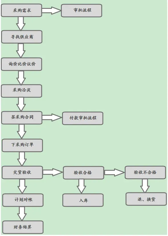 (二)基本流程:采购需求—寻找供应商—询价、比价、议价—采购洽谈—合同的签订—交货验收—质检—入库—计划对账—财务结算