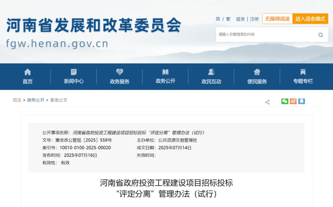 近日,河南省发改委印发《河南省政府投资工程建设项目招标投标“评定分离”管理办法(试行)》。本办法自印发之日起施行,有效期两年。
