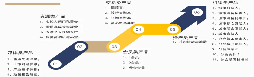 打造媒体类(董监高访谈录等)、资源类(实控人闭门私董会等)、会员类(I/O 会员等)、交易类(链接官、投行账本等)、资产类(并购赋能加速器等)、组织类(链接合伙人等)产品,全方位满足上市公司与合作伙伴的需求。