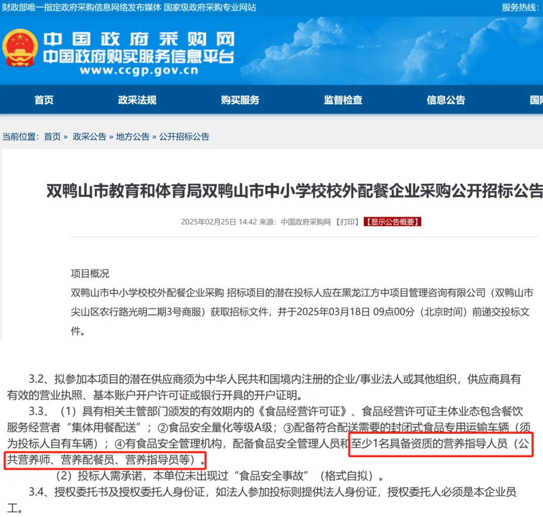 以近期的政府采购招标项目为例,在双鸭山市教育和体育局关的公开招标公告中,明确要求潜在供应商需配备至少1名具备资质的营养指导人员,其中包括公共营养师。