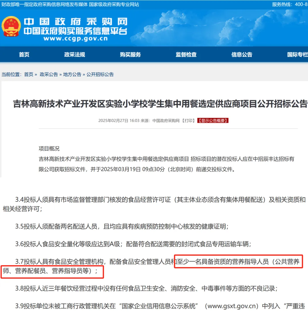 同样,吉林高新技术产业开发区实验小学学生集中用餐选定供应商项目公开招标公告也提出,投标人必须至少一名具备资质的营养指导人员(含公共营养师)。