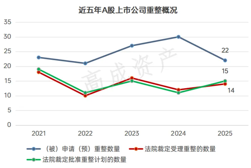 据高成资产统计,2025年全年共有22家上市公司(被)申请破产重整,此外还有21家上市公司早在2025年之前就进入(预)重整程序,但其重整程序延续到了2025年。