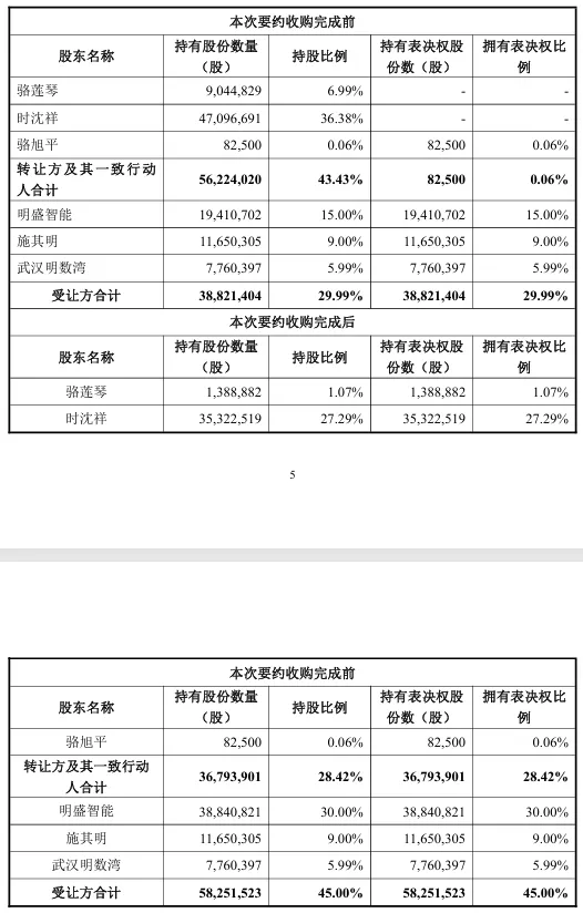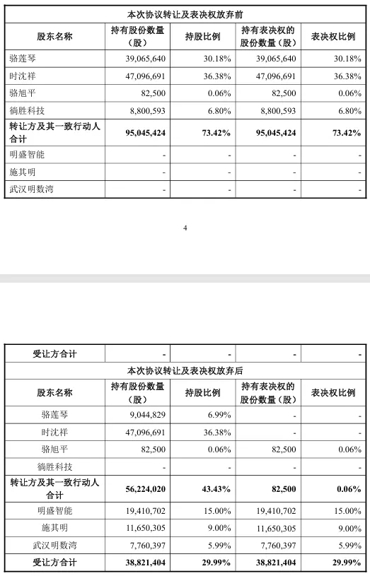 据公告披露,公司控股股东、实际控制人时沈祥、骆莲琴及其关联方上海徜胜科技有限公司,已于当日与上海明盛联禾智能科技有限公司、自然人施其明及武汉明数湾科技合伙企业签署《股份转让协议》。受让方将以每股29.41元的价格,合计受让约3882.14万股公司股份,占总股本的29.99%,交易对价超过11亿元。交易完成后,受让方将成为公司新的控股股东,实际控制人将变更为施其明。尤为关键的是,协议设置了表决权让渡条款,转让方承诺在股份交割后,即放弃其持有的全部剩余股份所对应的表决权,除非取得收购方书面同意,该放弃的表决权将始终不恢复。