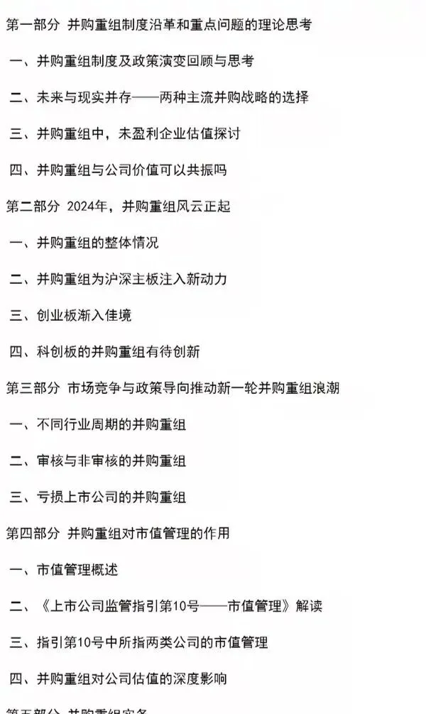 《并购重组手册》:回顾A股历次并购重组浪潮演进规律,聚焦2024年并购重组制度改革要点(如审核效率提升、非盈利企业并购估值规则),并展望“政策导向+市场竞争”双驱动下的新一轮并购机遇(如不同行业周期并购策略、亏损上市公司重组路径)。