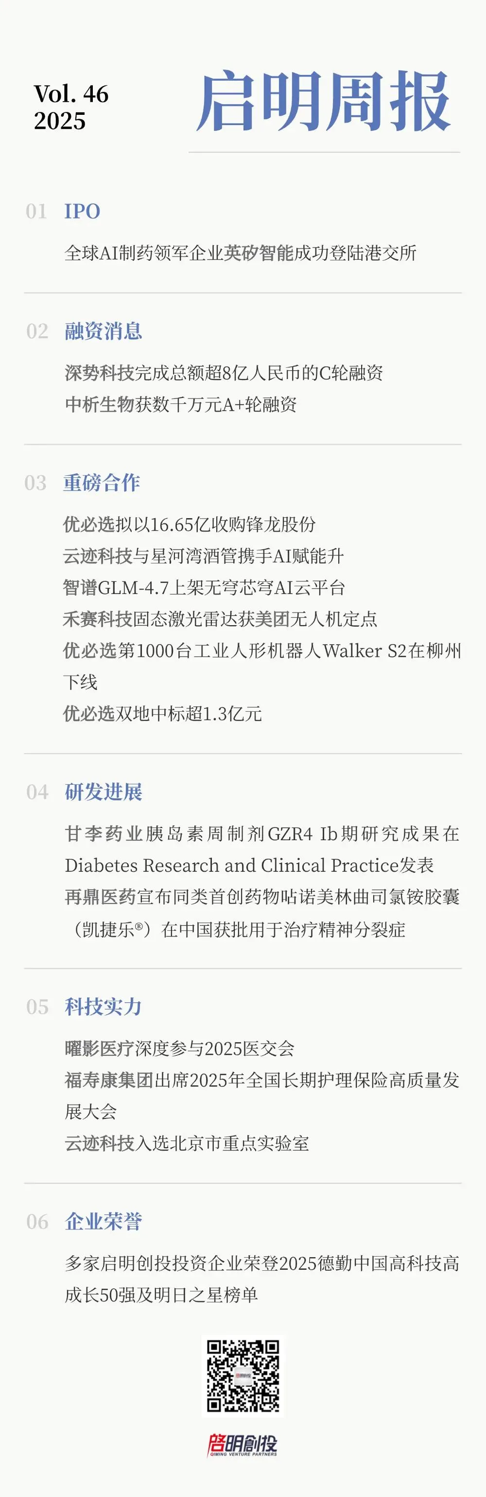 北京时间2025年12月30日,启明创投投资企业、全球领先的AI制药公司英矽智能(Insilico Medicine)成功登陆香港交易所,成为2025年港股市场最大Biotech IPO。英矽智能(03696.HK)发行价24.05港元/股,开盘价35.00港元/股,市值195.1亿港元。