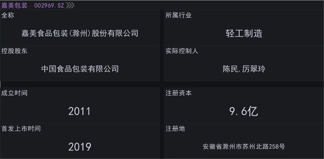 嘉美包装全称叫做嘉美食品包装(滁州)股份有限公司,注册地在安徽省滁州市,股票2019年在深交所上市,公司的控股股东是中国食品包装有限公司,实际控制人是陈民和厉翠玲,组织形式属于港澳台企业,审计机构是天衡会计师事务所。